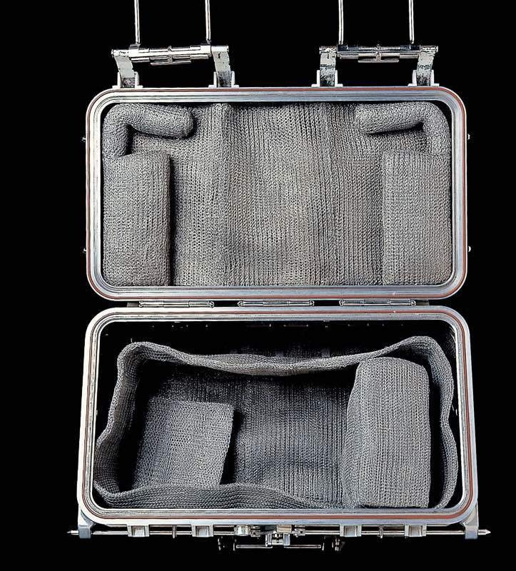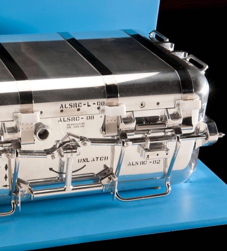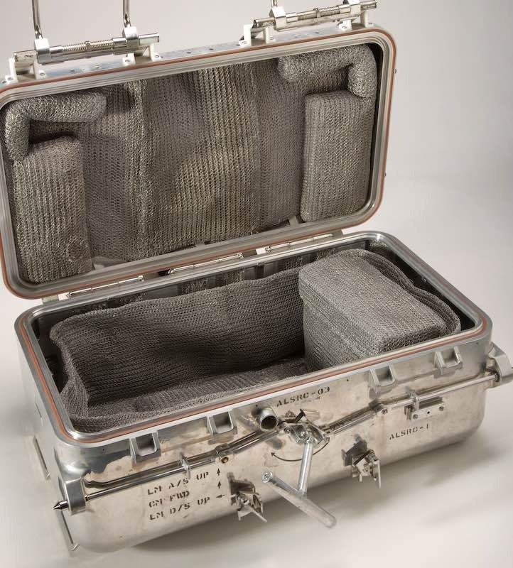 ALSRC (The Apollo Lunar Sample Return Container - アポロ11号で月の石を持ち帰るための入れ物)は、月の石と土のサンプルを月から持ち帰るために製作されました。アルミ製ケースの半分に分かれた上下のシェルが接するところは、三重の密封構造になっていました。このケースは月の環境と同じ状況、つまり真空を保つように、ゼロハリバートンによってデザインされました。
